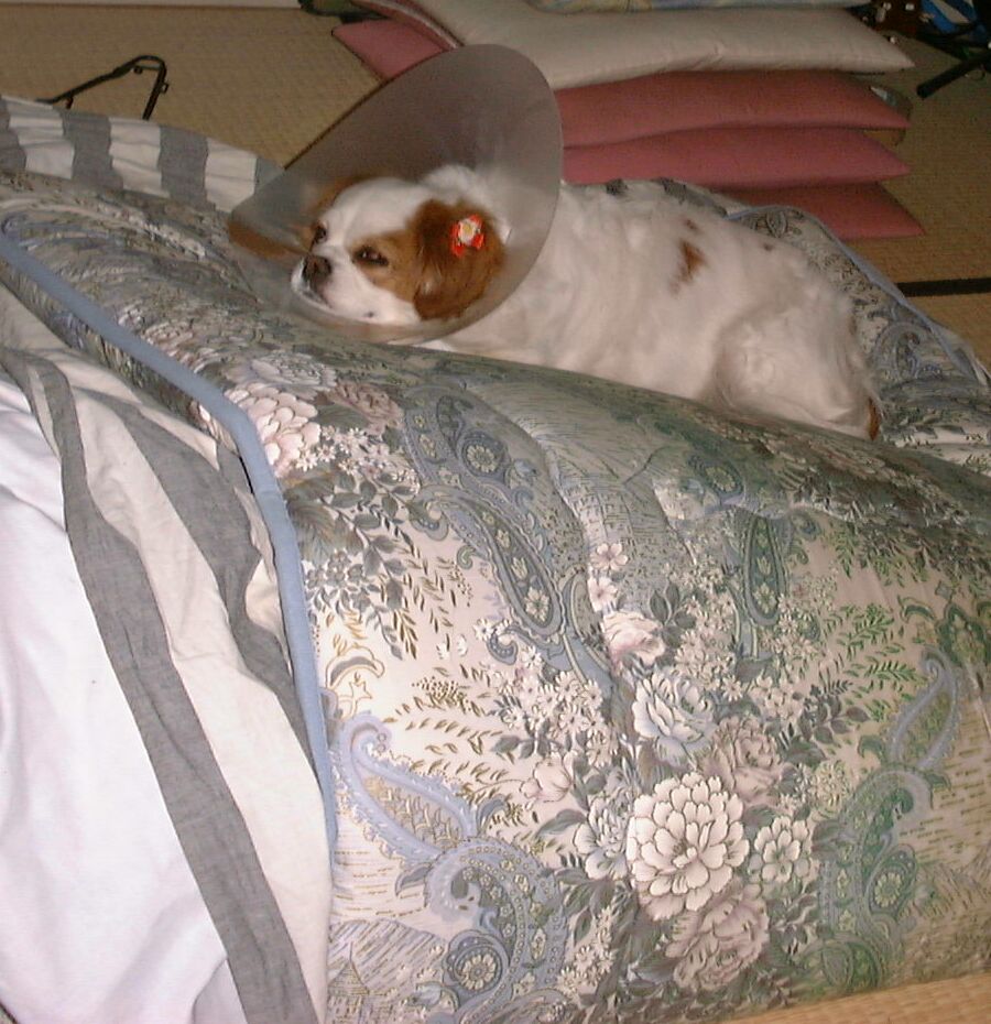 左足の爪を怪我してしまい、エリザベスカラーをつけられちゃいました 2002/02/15頃